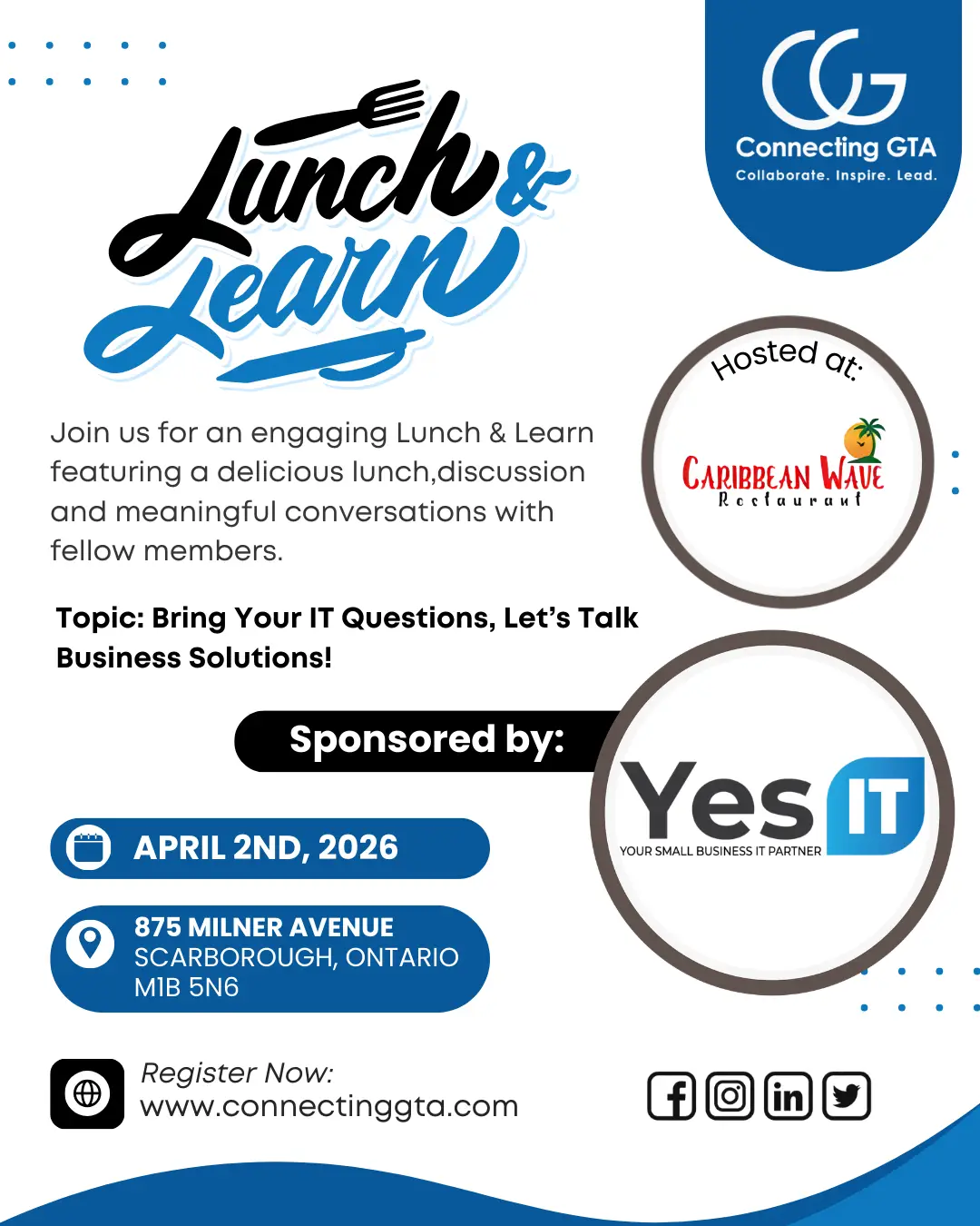 Join Connecting GTA for an engaging Lunch & Learn designed for small business owners and professionals looking to strengthen their IT strategies. This interactive session invites you to bring your IT questions and explore practical, real-world business solutions in an open discussion format.